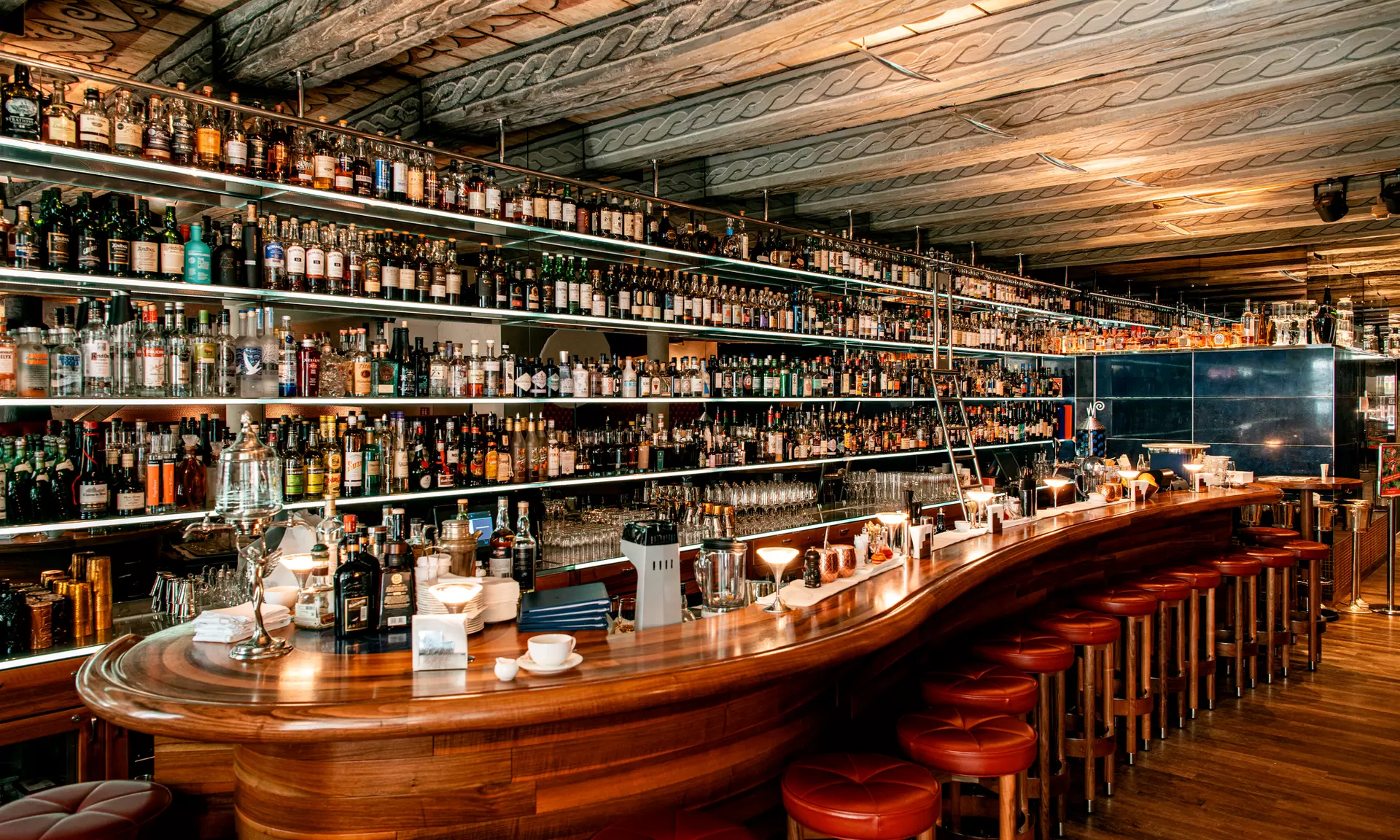 Le serate si concludono spesso con uno sguardo alla “Library of Spirits”, che si vanta di conservare più di 1.000 bottiglie diverse.